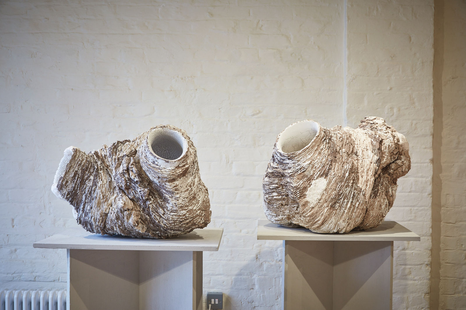 " [These] empathetic, passionate sculptures explore the bodily in relation to land, space and time – surfaces poised between skin and rock as a representation of living human/nature. Coarse, highly grogged clay bodies have iron chromate and manganese dioxide applied and colours underscore restless animation. We discern blackness, congealed blood reds, ecru, onyx, shades of brown, grey — and white.. "